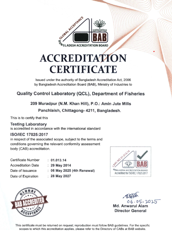কোয়ালিটি কন্ট্রোল ল্যাবরেটরী, মৎস্য অধিদপ্তর, চট্টগ্রাম বাংলাদেশ এ্যাক্রিডিটেশন বোর্ড কর্তৃক স্বীকৃত একটি ল্যাব যা সর্বপ্রথম এ্যাক্রিডিটেশন পায় মে, ২০১৪ সালে যাহা চলমান রয়েছে। বর্তমানের এ্যাক্রিডিটেড টেস্ট স্কোপের সংখ্যা ৩৮ টি।
